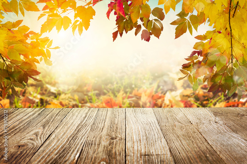 Wooden table with autumn leaves background