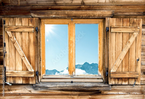 weathered mountain hut window shutter