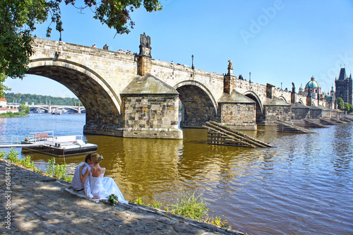 Wedding couple on the waterside of the Vltava River