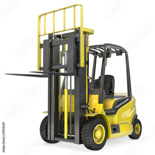 Yellow fork lift truck with raised fork, front view