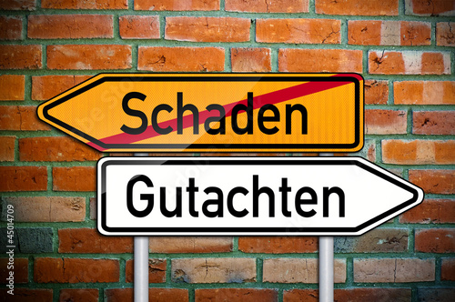 Wegweiser auf Ziegelsteinwand mit Schaden und Gutachten