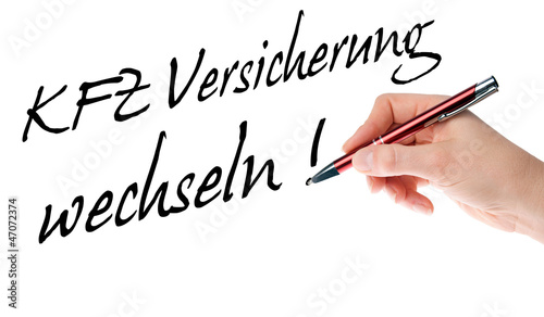 Hand mit Stift schreibt KFZ Versicherung wechseln
