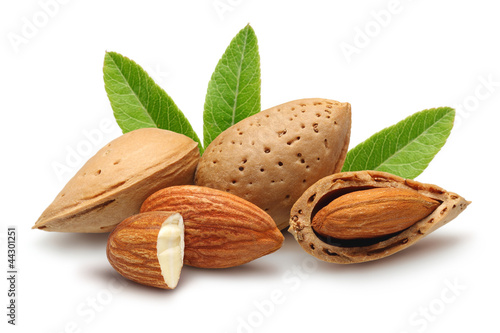 almonds, shelled almonds and leaves