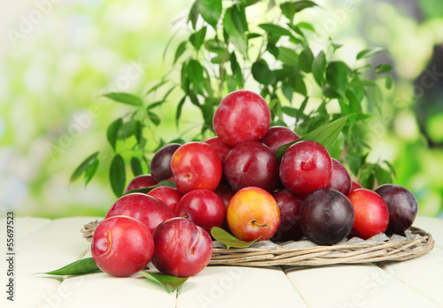 Ripe plums in basket on wooden table on natural background