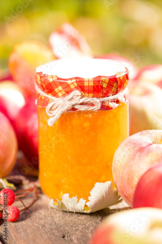 Apple jam and fruits on wooden table