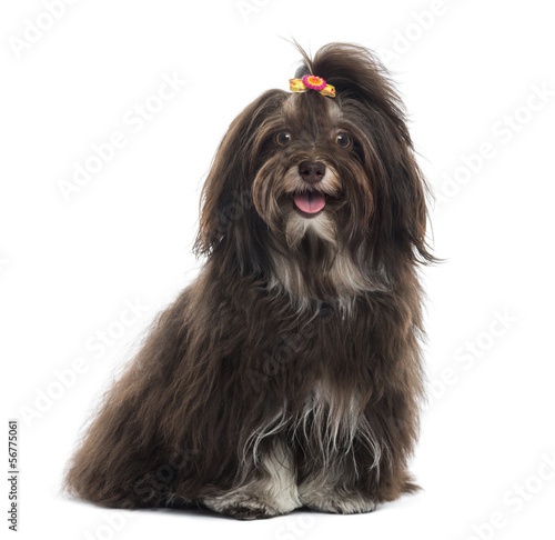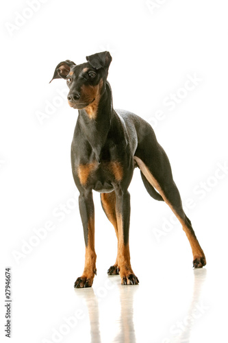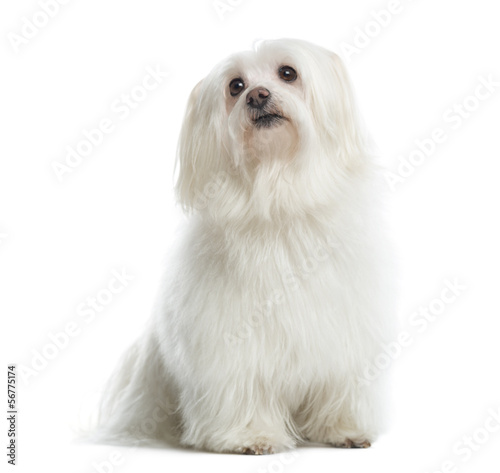 Great Dane looking at a Chihuahua sitting, isolated on white