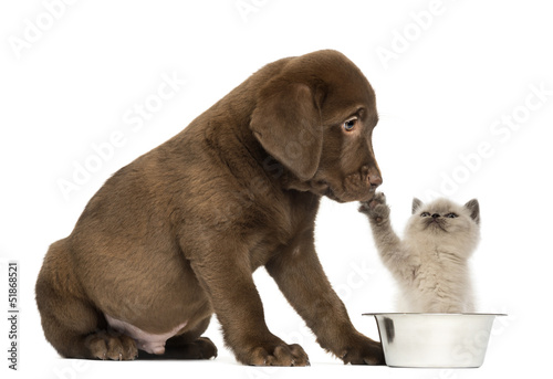 Labrador Retriever Puppy looking at a British Longhair kitten