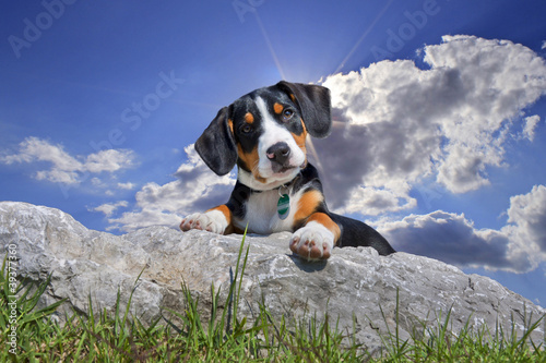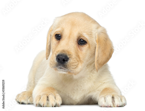 Labrador Retriever Puppy lying down, 2 months old, isolated