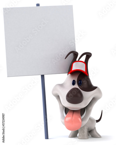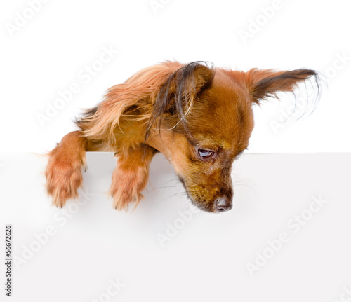 Dog above white banner looking down. isolated on white