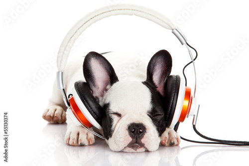 dog listening to music with headphones isolated on white backgro