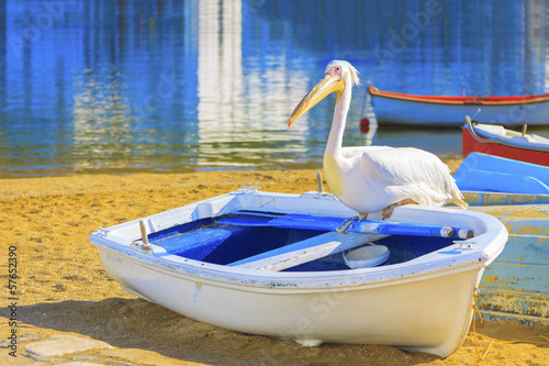 Pelican Petros in Greece Mykonos island in Cyclades, the famous