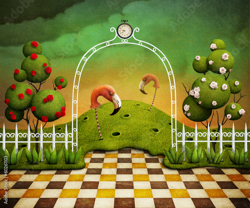 Bright green background with Arch, roses and flamingos
