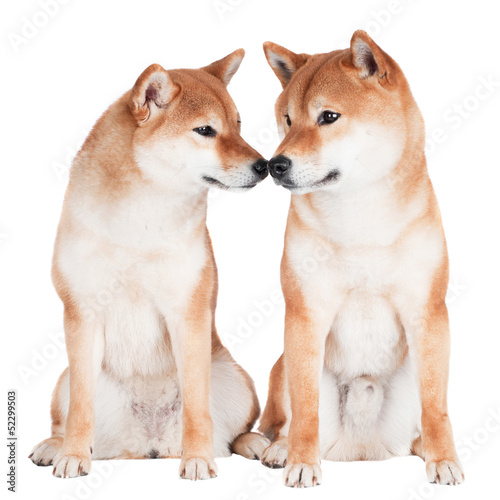 two shiba inu dogs touching with their noses