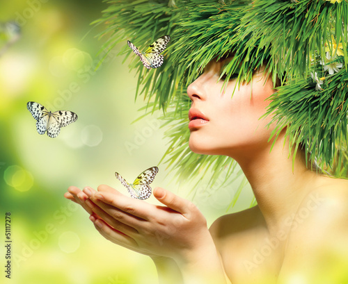 Spring Woman. Summer Girl with Grass Hair and Green Makeup