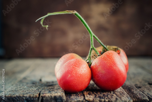 Composition from Red Tomatoes with drops on the wooden backgroun