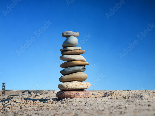 Steinpyramide im Sand vor schönem blauen Himmel