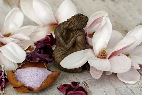 Buddhafigur mit Magnolienblüten