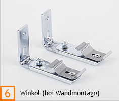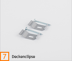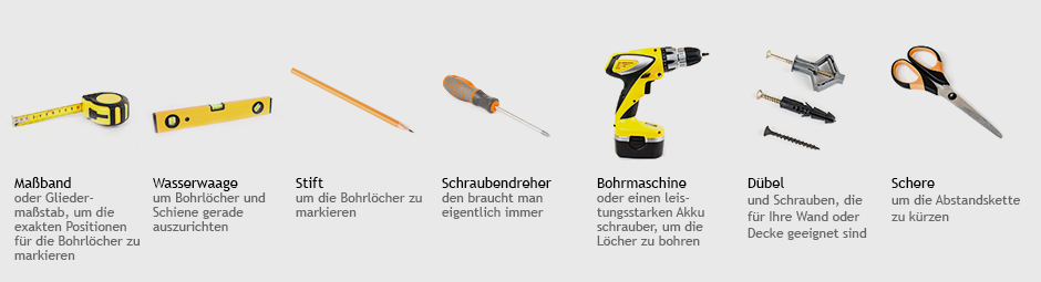 Sie erhalten gemäß Ihrer Schienenlänge eine gewisse Anzahl an Montageclipsen oder Wandwinkeln. Die Äußeren sollten max. 10cm vom Schienenende entfernt montiert werden. Alle anderen Clipse / Winkel teilen Sie dazwischen gleichmäßig auf. Es sollte aber max. ein Abstand von 110cm zwischen den einzelnen Elementen sein.