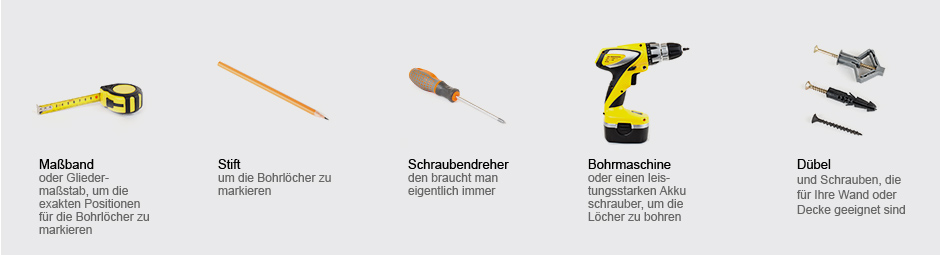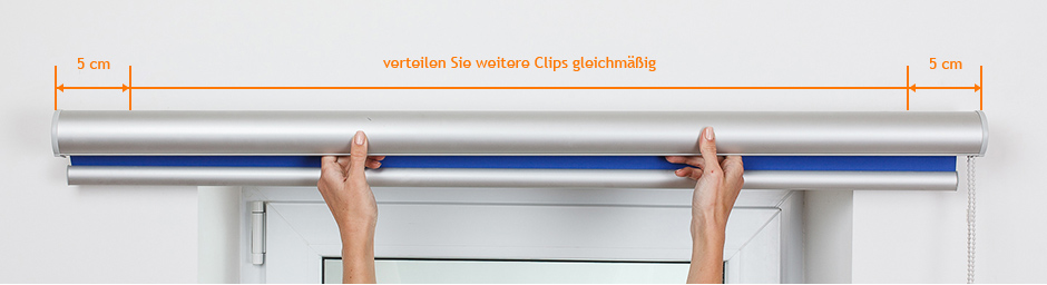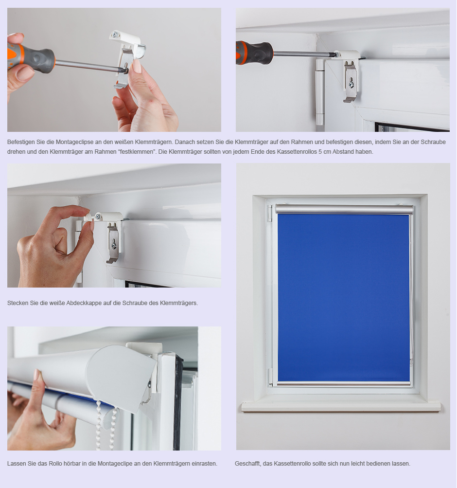 Messen Sie gemäß Ihrer bestellten Breite die Bohrlöcher aus, die Sie für die Seitenträger benötigen. Bohren Sie dann die Löcher. Befestigen Sie die Montageclipse mit Dübel und Schrauben, die für Ihre Wände geeignet sind. Bitte beachten Sie, dass Dübel und Schrauben nicht zum Lieferumfang gehören. Lassen Sie die Montageschiene in die Clipse hörbar einrasten. Wenn Ihr Kassettenrollo an den Montageclipsen montiert wurde,....![]() ...sollten sie es problemlos bedienen können und es sollte sich leicht öffnen und schließen lassen. |